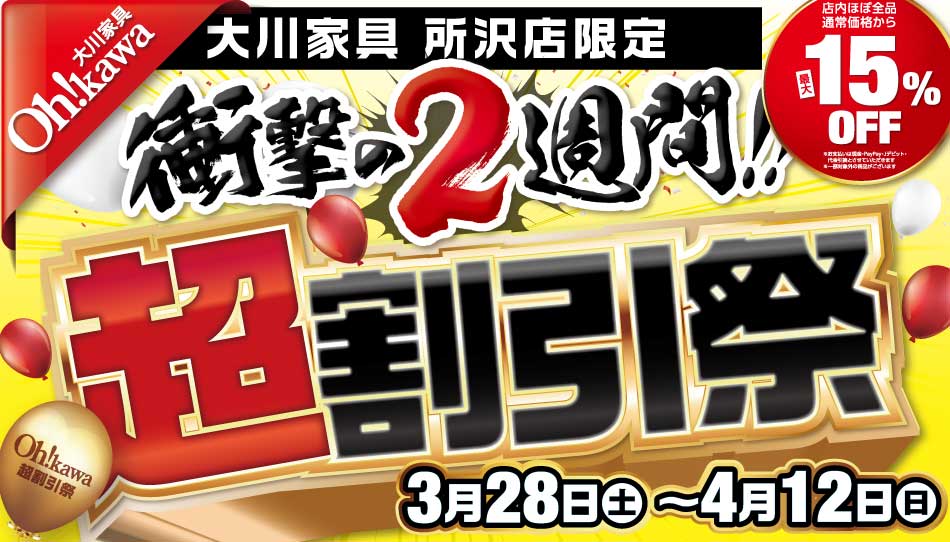 2026.4.12まで所沢店【店内ほぼ全品対象 最大15%OFF】超割引祭