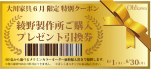 2025年05月24日 coupon2506_coupon « 綾野製作所製品に使える大川家具WEBクーポン 最新の記事 2026.04.08【大川家具】パラマウントベッド「Active Sleep」プレゼントキャンペーン開催!(4/11〜5/10) 2026.03.05テーブル塗装64[2026.1 M様] 2026.03.05椅子の張り替え事例198 [2026.1 C様] 2026.03.05椅子の張り替え事例196 [2026.1 W様] 2026.03.05椅子の張り替え事例197 [2026.1 F様]