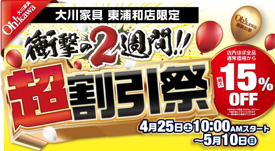 大川家具東浦和店では4/25(土)~5/10(日)の期間【超割引祭】を開催!!期間限定で店内ほぼ全品、通常価格から最大15%OFFの超割引特価でご提供!!この機会をお見逃しなく!