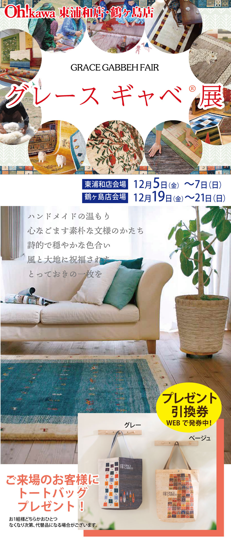 【世界遺産の手織絨毯】グレースギャベ展 大川家具東浦和店・鶴ヶ島店で遊牧民族の手織り絨毯「グレースギャベ展」を開催いたします。 玄関マットサイズからラグサイズまで選りすぐりの200点以上の豊富な展示の中から最適な1品をお選びいただけます。 WEB招待状のご提示で素敵なご来場記念品をプレゼント。 お気に入りのギャベを特別価格でご購入いただけます。