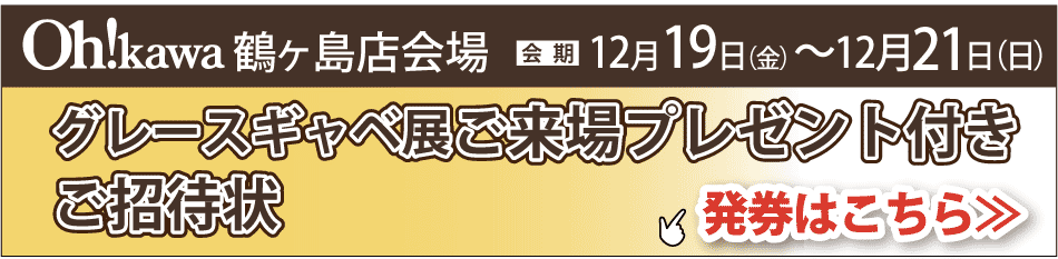 【鶴ヶ島店】 期 間 12月19日(金)-12月21日(日) 住所 埼玉県鶴ヶ島市三ツ木新町2-8-3 連絡先 大川家具 鶴ヶ島店 (TEL:049-287-8011) ●アクセス・・・圏央道 鶴ヶ島インターおりて、はじめの信号を左折すぐそば ※Oh!kawaインテリアモール内