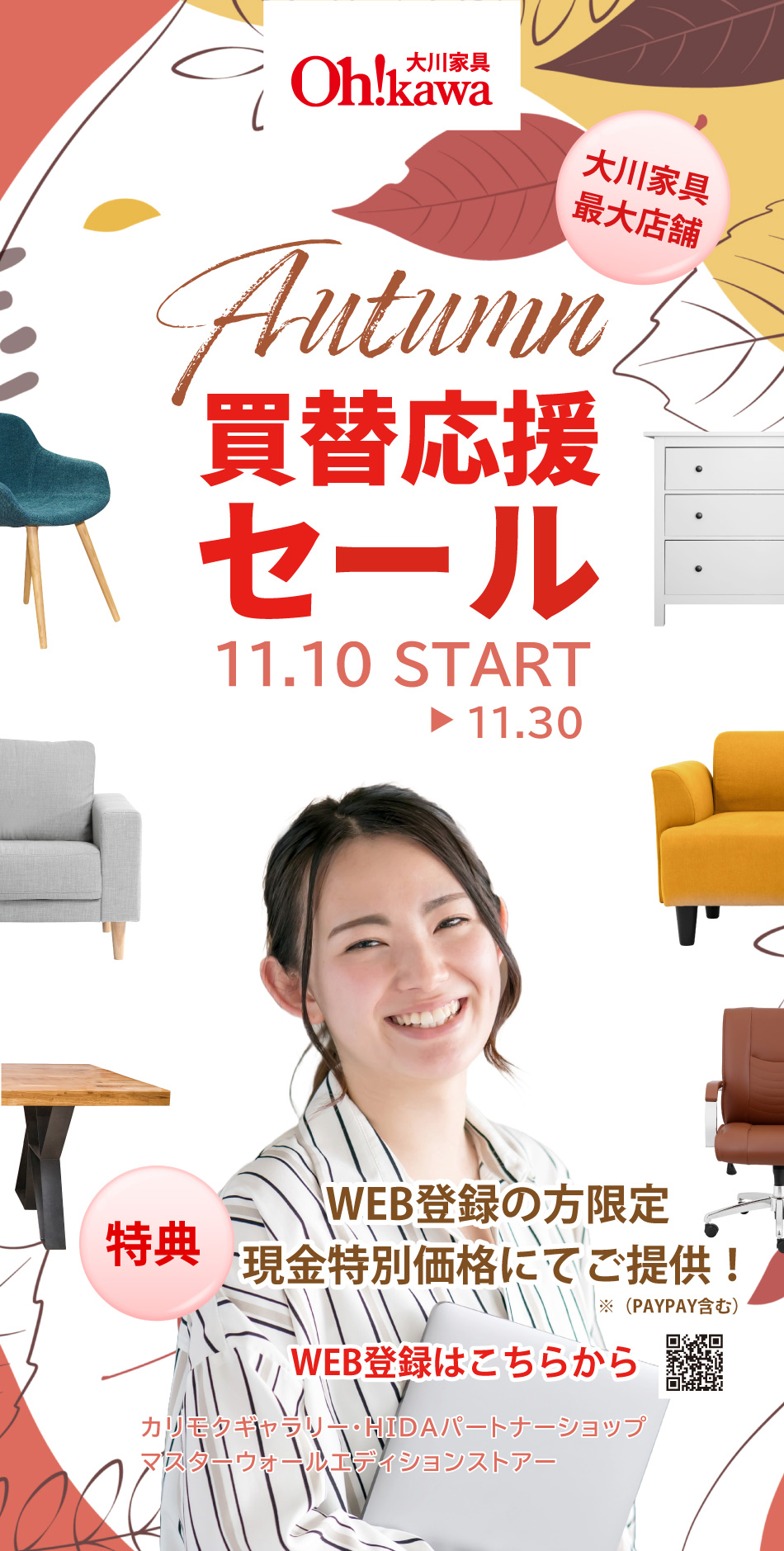 12/1から12/25までの期間、大川家具東浦和店でクリスマスセールを開催。ホームページよりご招待状にご登録いただいたお客様に現金特別価格(PayPay可)にてご提供。お会計時に招待状の画面をご提示下さい。ダイニング・ベッド・リビング等、大川家具最大の品揃えとなっております。お得な展示処分品も多数ご用意しておりますので、是非この機会に東浦和店をご利用下さい。