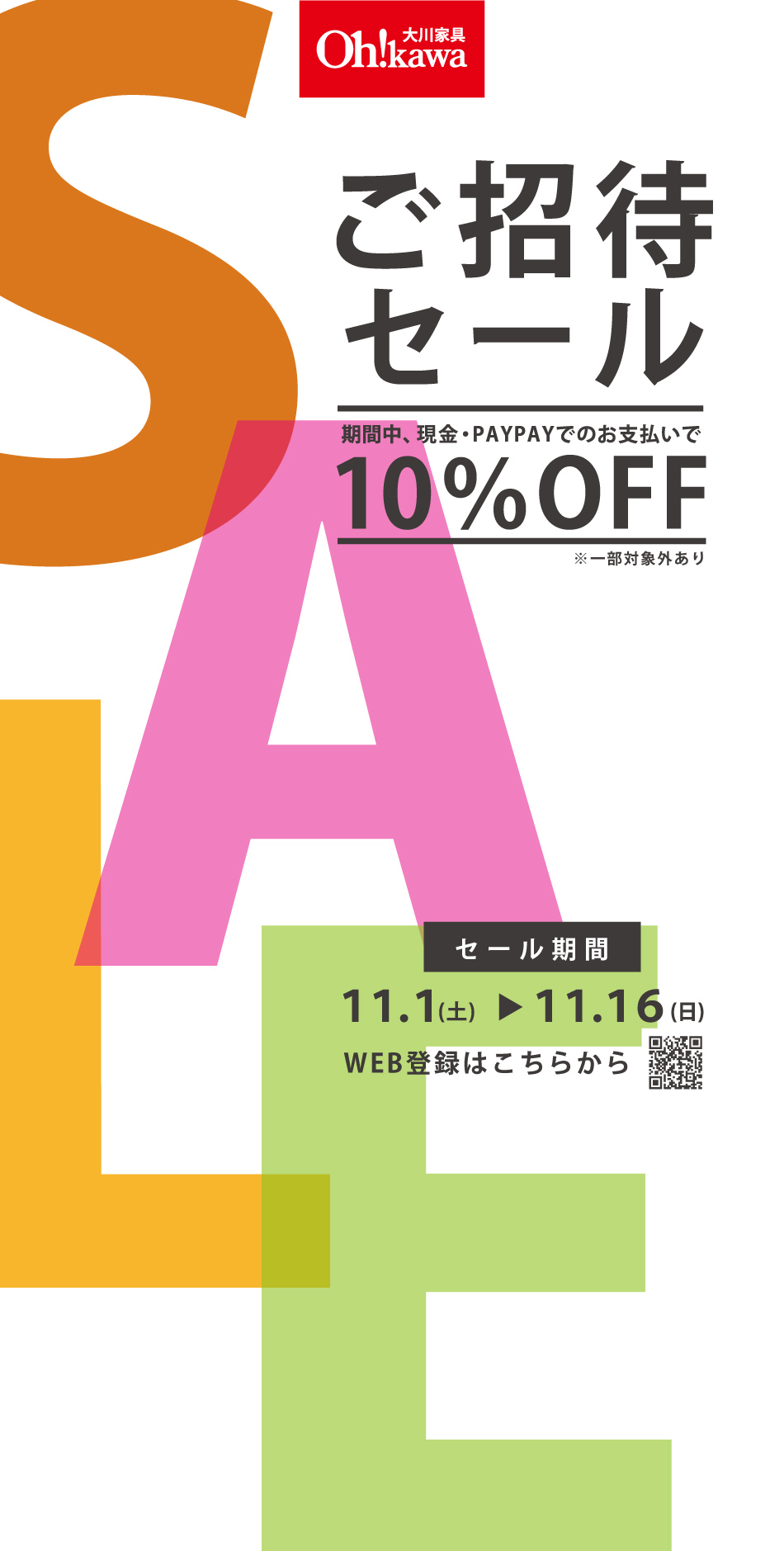 大川家具戸田店では、11/1から11/16まの期間、ご招待セールを開催致します。現金もしくはPAYPAYでのお支払いでお取り寄せ品を10%OFFにてご提供させていただきます。