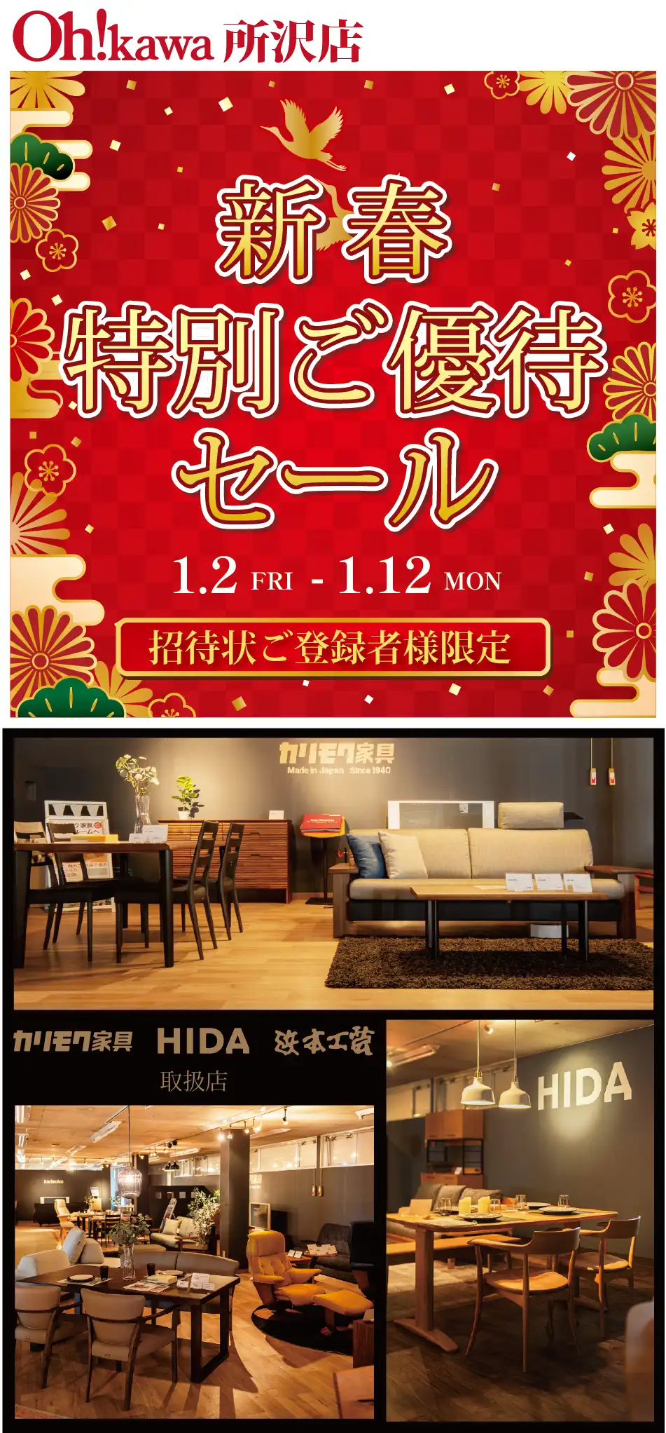 1/2~1/12までの期間、大川家具所沢店では「特別ご招待会」を開催いたします。