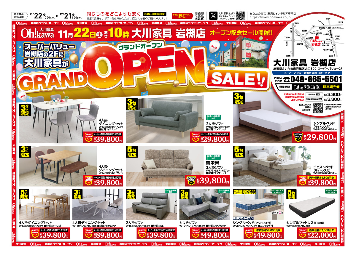 11/22にスーパーバリュー岩槻店の2Fにオープンする大川家具の新店舗です。 ワンフロアの広々した店内には、有名ブランドメーカーをはじめ、暮らしをより豊かにしてくれる最新トレンドの家具が勢揃い。 約1,000台を収容できる大規模な駐車場がございます。お近くにお越しの際はぜひお立ち寄りください。