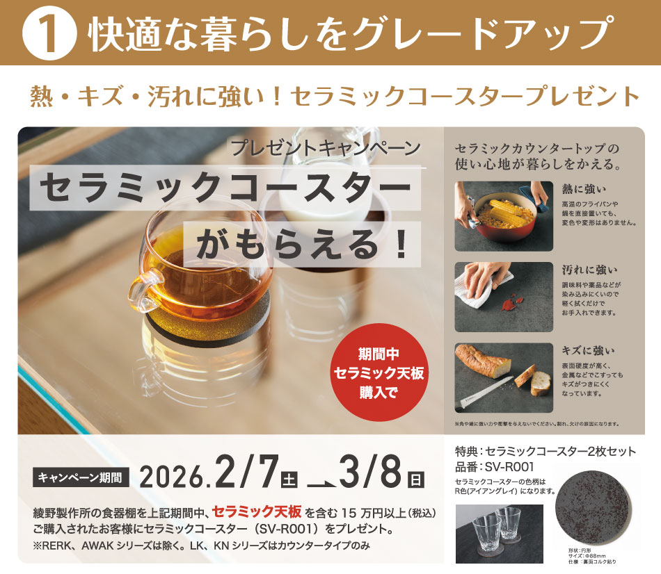 綾野製作所が自信を持ってお届けする「セラミック天板」の魅力を、毎日使えるコースターで体感してください。
