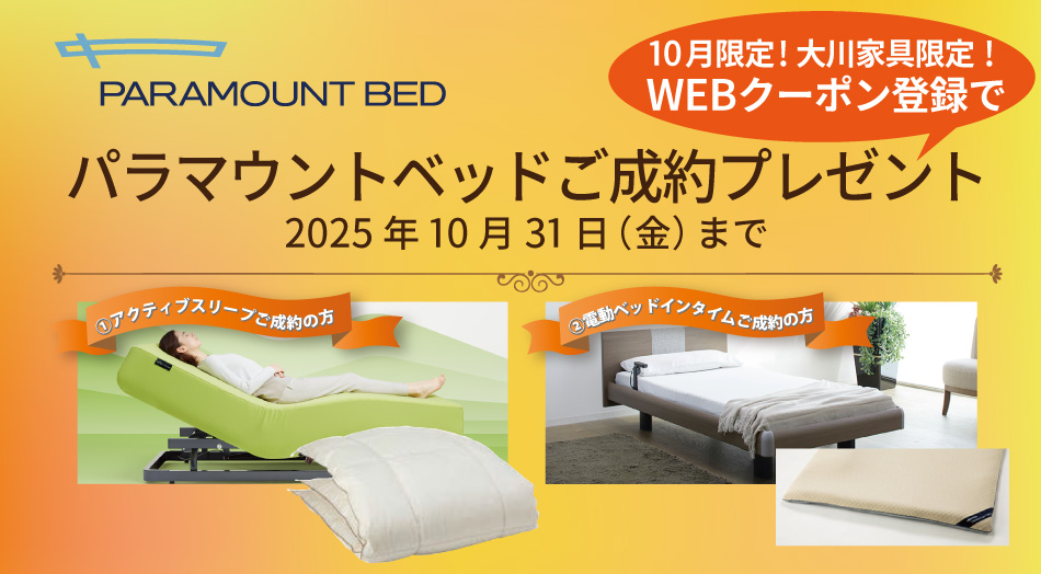 クーポン 10月限定!パラマウントベッドのご購入をお得に!大川家具限定WEBクーポンをご利用ください 「オンラインショップで商品の一部をご覧いただけます」 パラマウントベッドの商品は、大川家具のサブスクリプションサービスでもご利用いただけます。